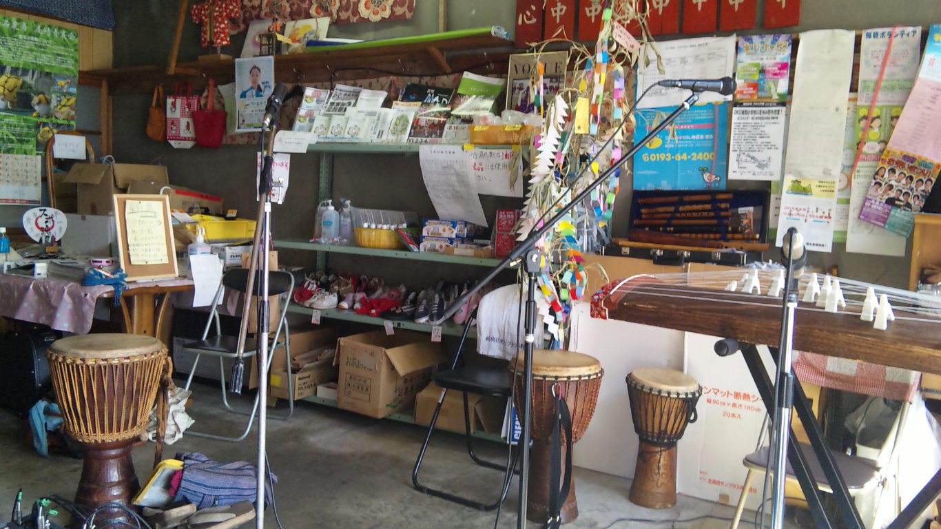 8/5セーブ岩手さんにて。 支援物資が置かれている番屋で演奏。