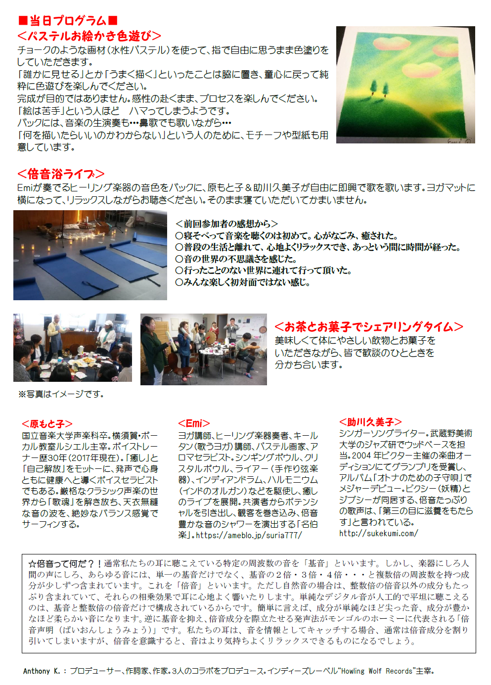 Emiが奏でるヒーリング楽器の音色をバックに、原もと子&助川久美子が自由に即興で歌を歌います。ヨガマットに横になって、リラックスしながらお聴きください。そのまま寝ていただいてかまいません。
