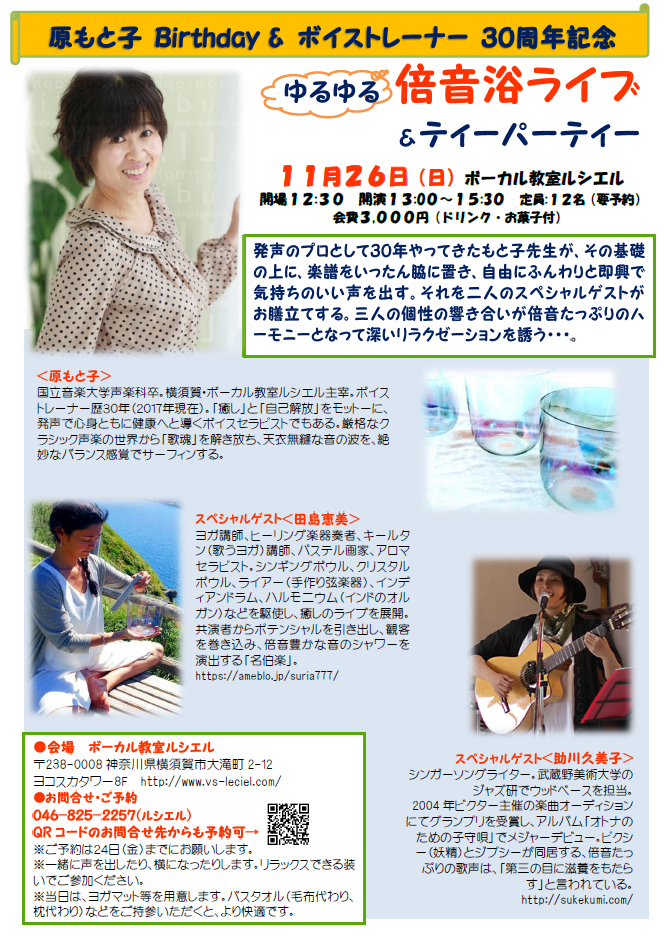今回は、私のボイトレの師匠・原もと子先生のバースデイ&ボイストレーナー30周年という節目で行われます。